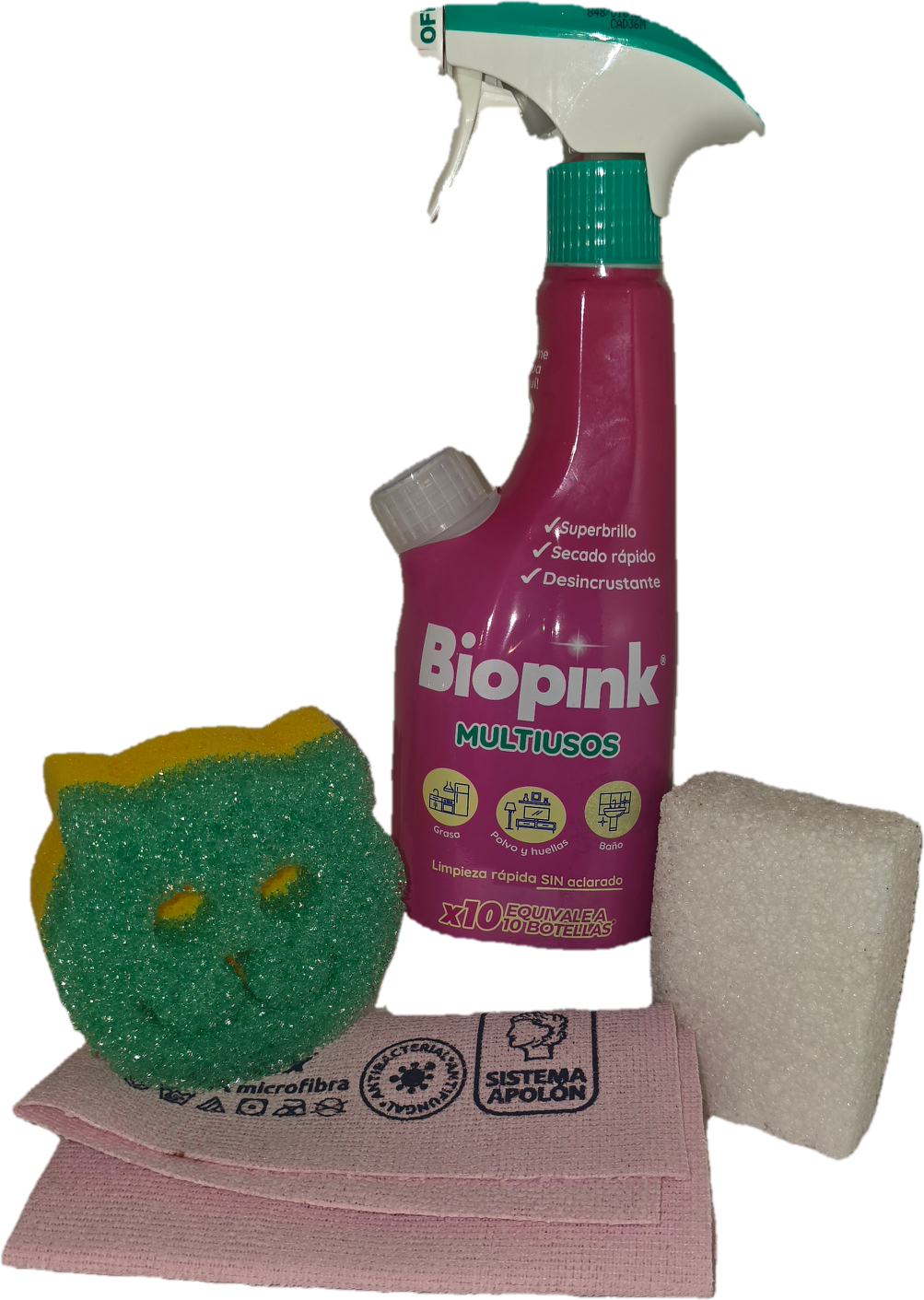 Caja especial con Biopink, multiusos desengrasante super concentrado,un todo en 1, en formato espuma rosa o spray que quita cualquier suciedad,sin lejía, huele genial. No corroe, ni necesita aclarado. 1 botella equivale a 7,5l de producto.INCLUYE: bayeta antibacteriana,piedra angular y estropajo térmico (no araña)